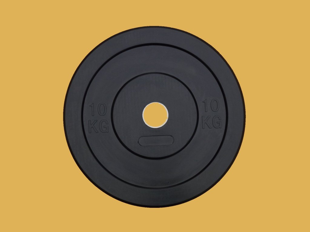 Železný kotouč (závaží) z litiny hmotnosti 10kg, typ BUMPER, pogumovaný. Průměr díry je určen na olympijské hřídele o průměru 50mm (vrtání díry je 51mm). Černá barva. Všechny hmotnosti mají stejný vnější průměr kotouče 44,5cm (mimo hmotností 1,25kg a 2,5kg, které jsou menší). Výhodou těchlo kotoučů je velice kvalitní provedení, extra hladký povrch, při cvičení "kotouče o sebe necinkají", chrání podlahu, lino, parkety, atd. Vysoká životnost.