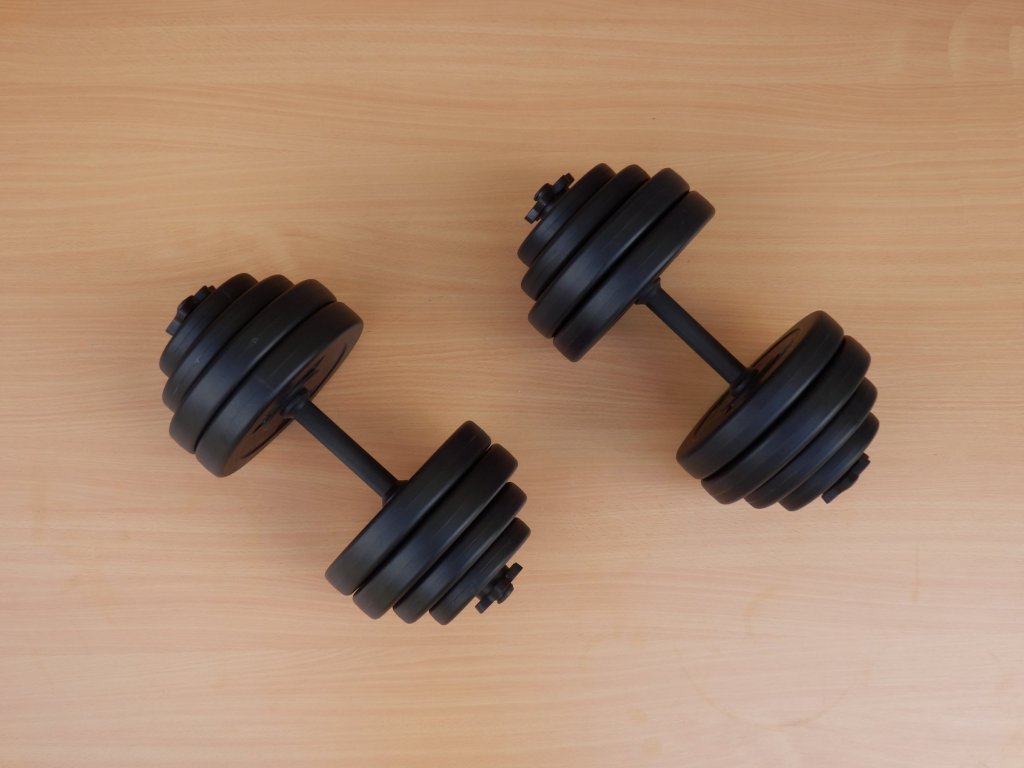 Sada jednoručních činek o celkové váze 2x15kg (každá závaží 4x2,5+2x1,25kg+2x1kg), plastové osy (váha hřídelí 2x0,5kg). Jedná se o nakládací činky, kotouče je možné libovolně přendavat, ubírat nebo přidávat.