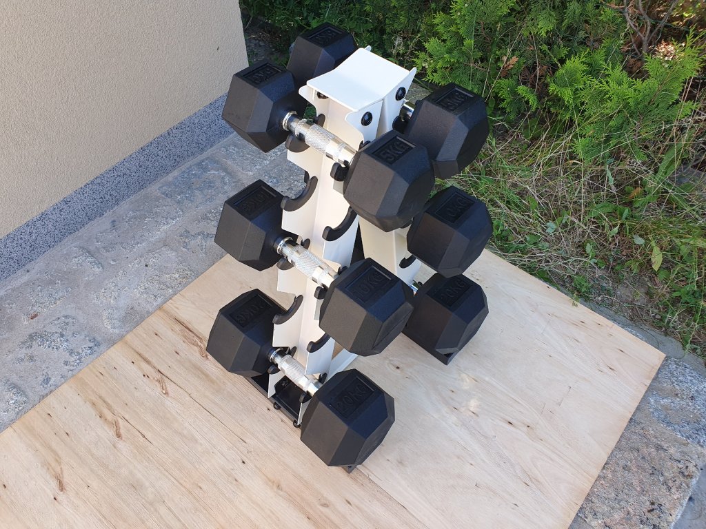 Kvalitní ocelový stojan na jednoruční činky, vyrobený ze silnostěnného profilu, který bezpečně snese i větší zatížení. Rozměr základny je 34x32cm, výška 65cm. Maximální nosnost je 150kg. Ačkoliv stojan nezabere moc místa, je dokonale stabilní a máte k dispozici možnost umístění až 5 párů jednoručních činek. U větších činek doporučujeme využít pouze tři patra aby se činky daly pohodlně vyndavat a následně zpět ukládat do stojanu (viz poslední foto).