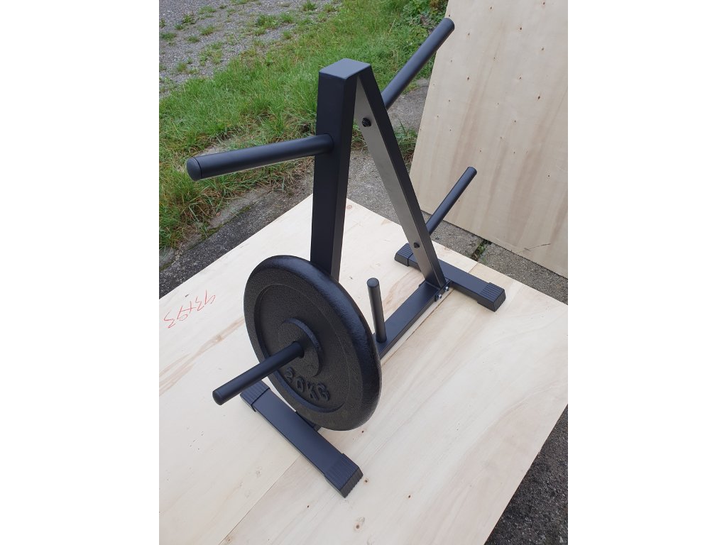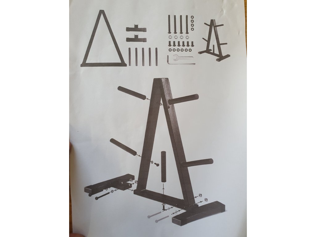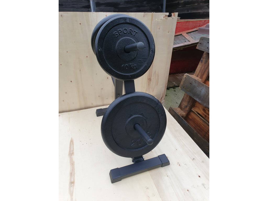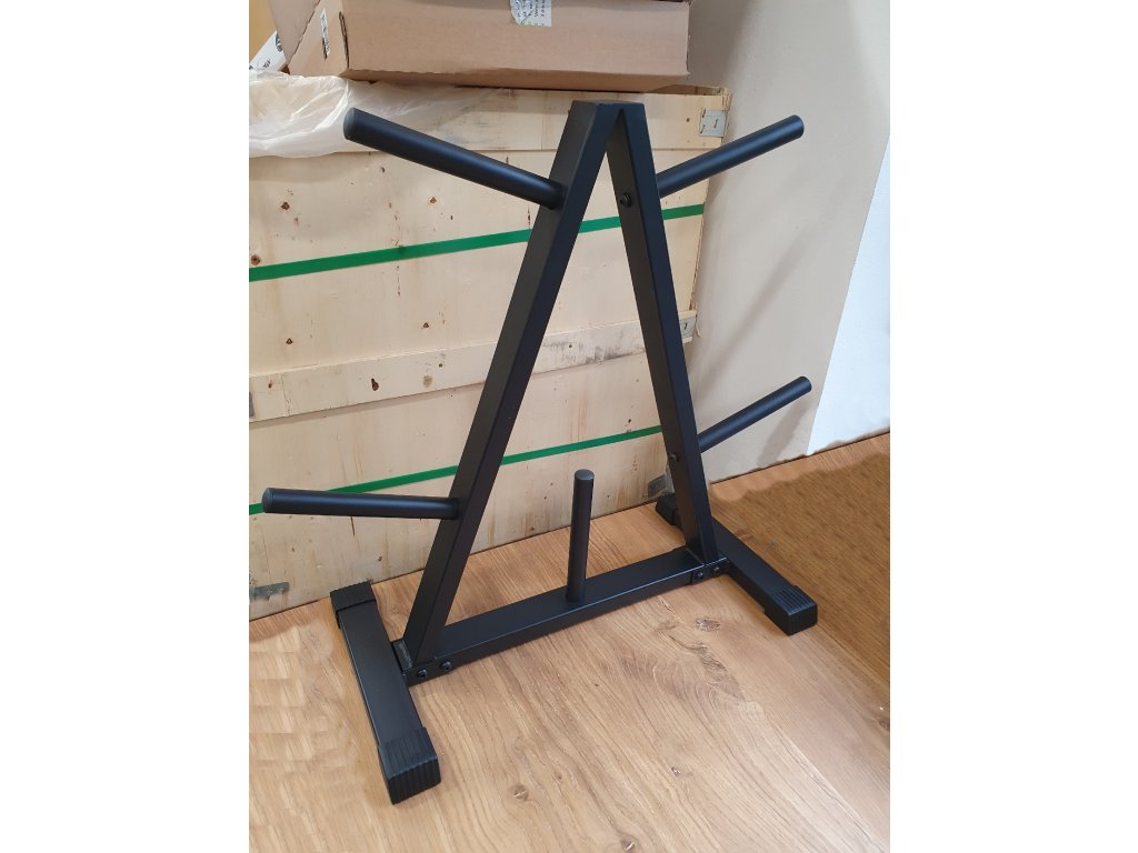 Jednoduchý a přitom praktický stojan na kotouče všech průměrů. Vynikající ergonomie a rozměry zaručí, že se na něj vejde mnoho závaží z Vaší domácí posilovny. Konstrukce profilů dosáhne maximální nosnosti 300 kg. Stojan má čtyři boční trny na závaží + 1 trn uvnitř na menší kotouče do 5 kg. Trny na závaží mají každý má délku 20 cm a průměr trnu je 25 mm, bez obav lze použít na kotouče s dírou 31 mm, (jsou na fotkách), můžete použít i na olympijské kotouče, tam je možné případně dokoupit redukce na olympijský průměr 50 mm pro větší pohodlí, ale lze použít bez obav i bez nich. Výšková rozteč mezi postranními trny je 37 cm (střed-střed), prostor dolů od spodního bočního trnu je 20 cm. Montáž se snadná, zvládne jedna osoba za 5minut. Dodáváno včetně imbusového i klasického klíče, dodáváno bez kotoučů, kotouče na fotkách jsou pouze na ukázku osazení.